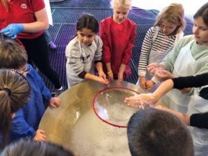 Mina: “Einzelne Kinder waren auch in einer Seifenblase drin.” Lucija: “Ich war mit Mina gemeinsam in einer drin.” “Und ich war mit Valentina in einer Seifenblase!”, sagt Mira. Lisa H. bemerkt: “Wir haben auch mit Trinkhalmen Blasen gemacht!”