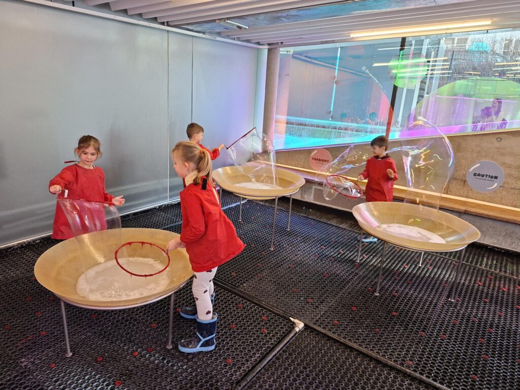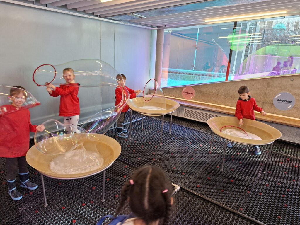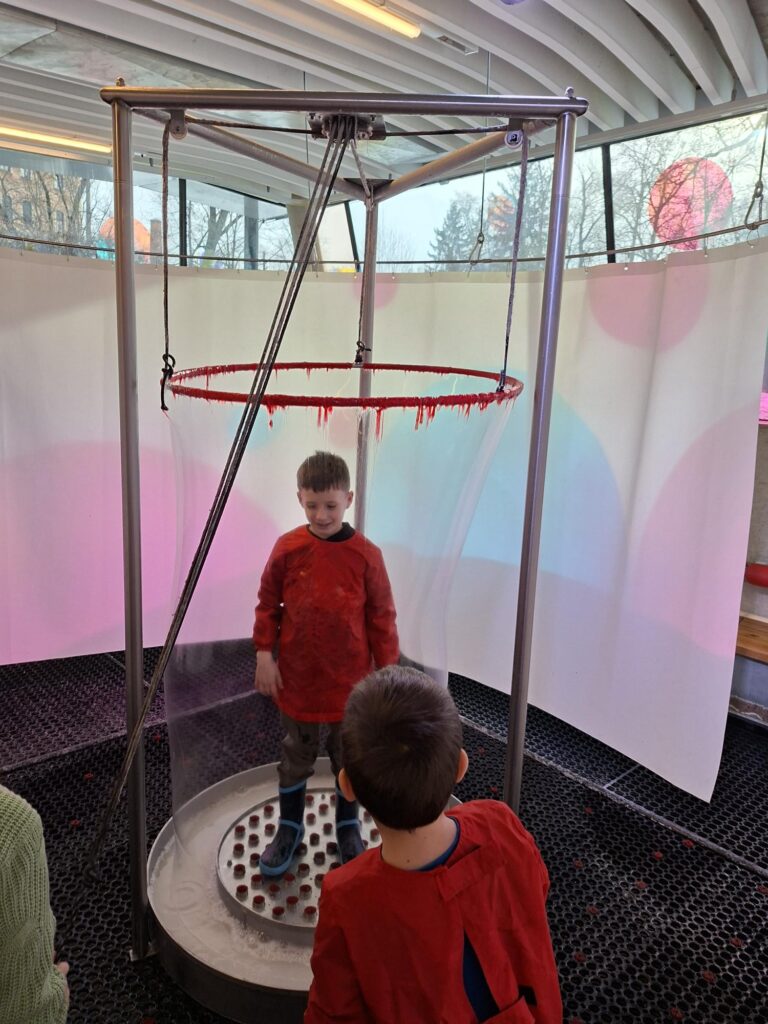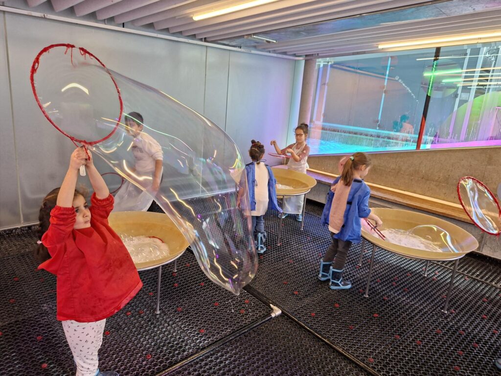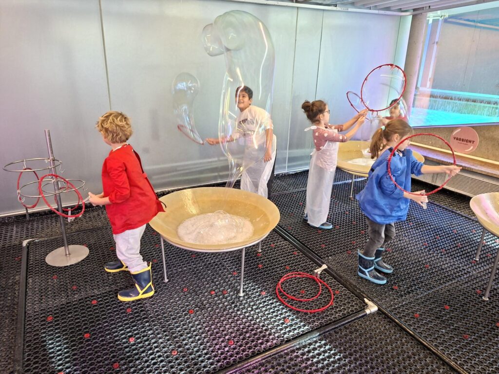 Im Anschluss besuchten wir die Seifenblasenausstellung, die für große Begeisterung sorgte. Riesige Seifenblasen wurden mit großen Reifen geformt, manche Kinder standen in einer großen Seifenblase und