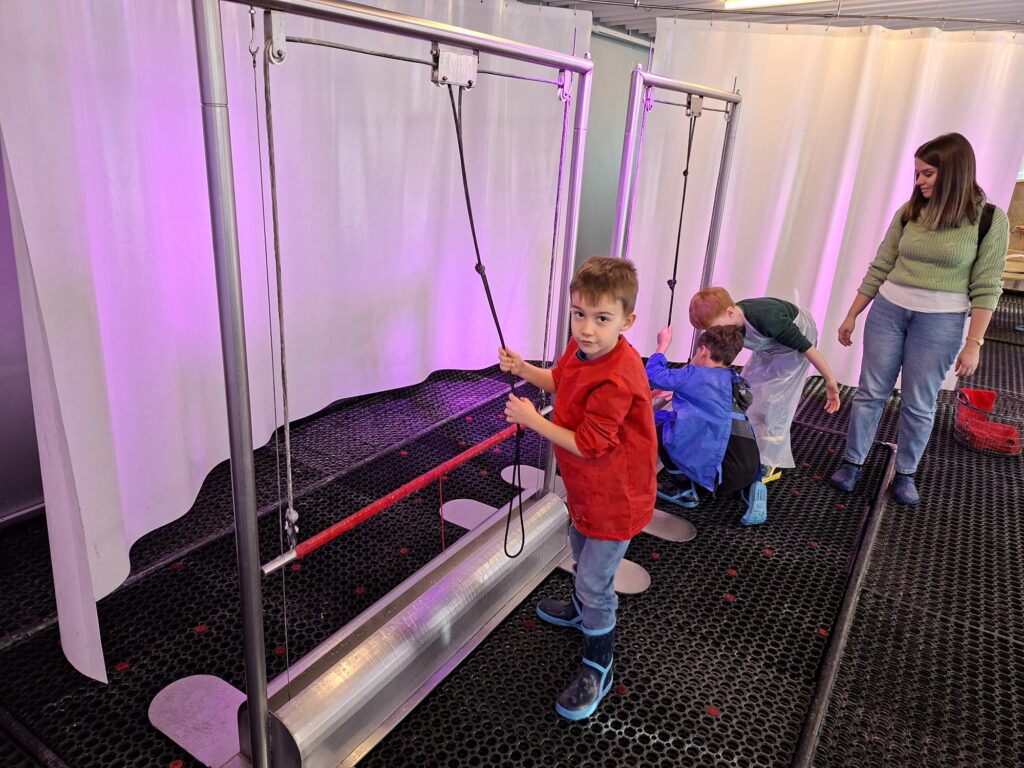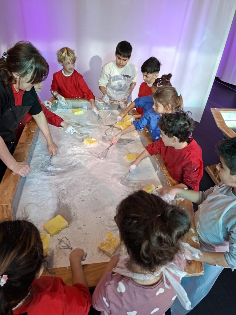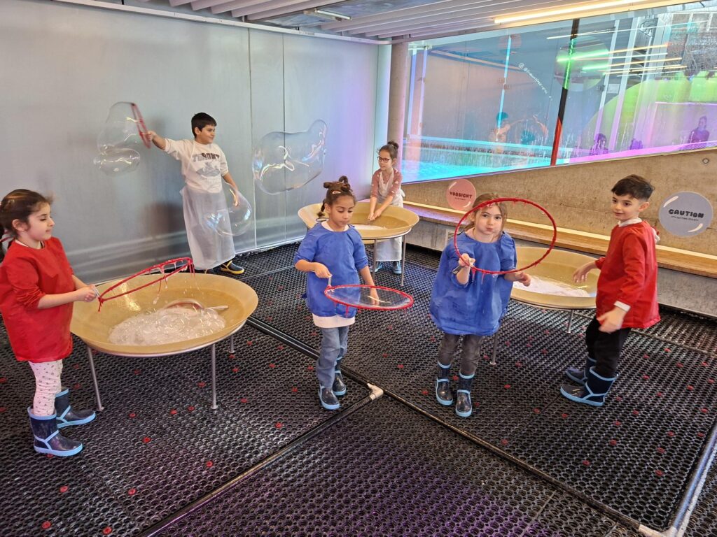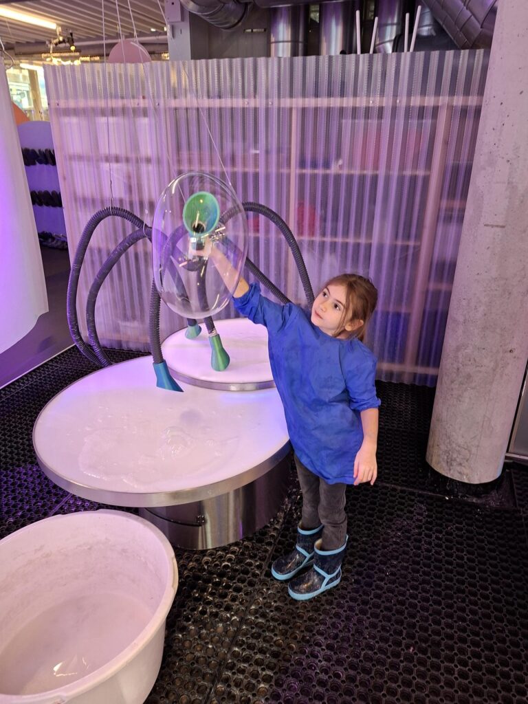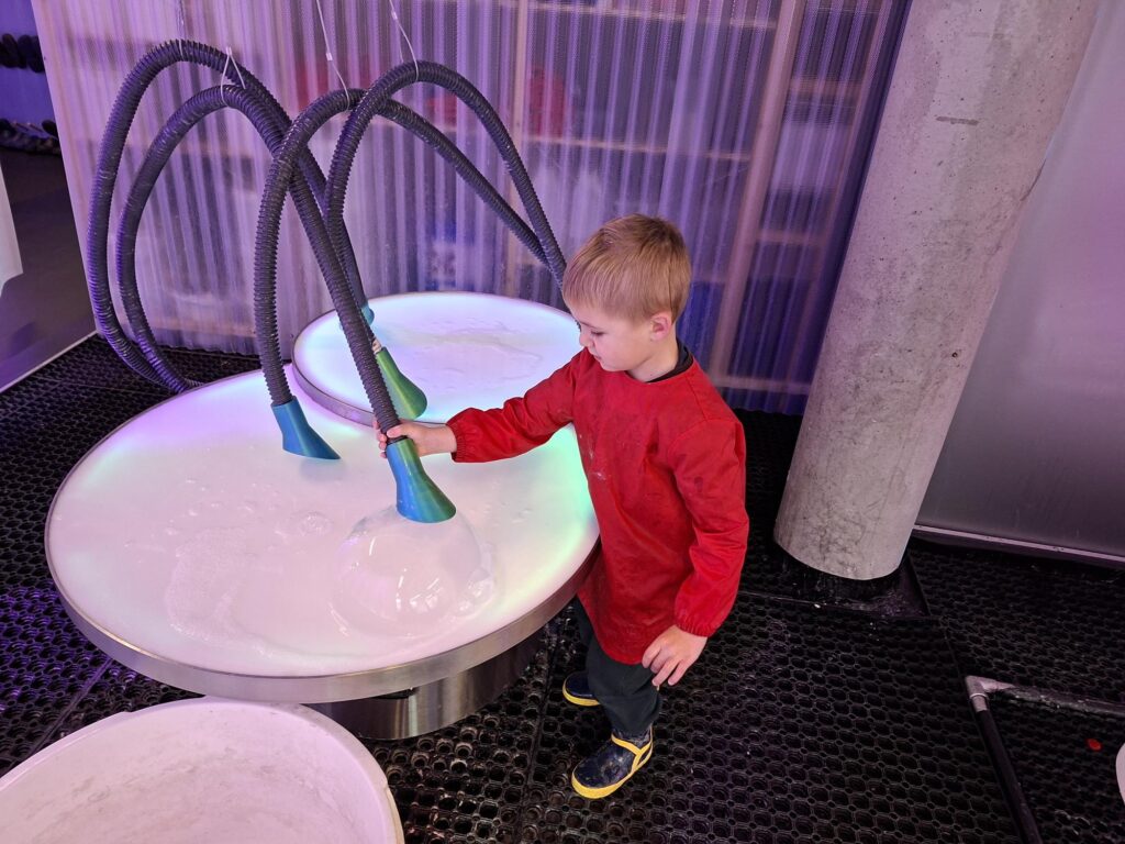 Im Anschluss besuchten wir die Seifenblasenausstellung, die für große Begeisterung sorgte. Riesige Seifenblasen wurden mit großen Reifen geformt, manche Kinder standen in einer großen Seifenblase und