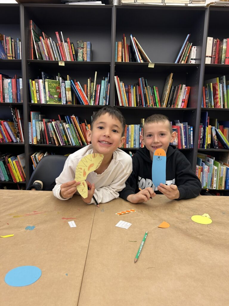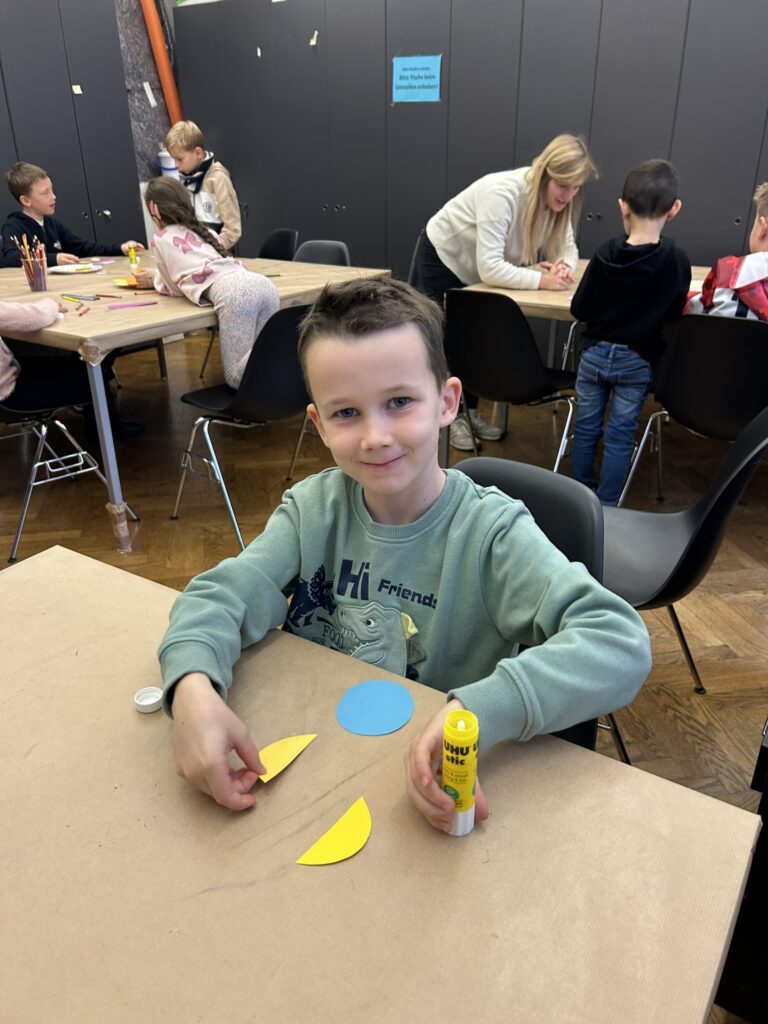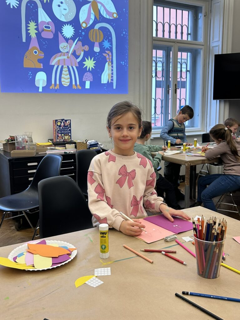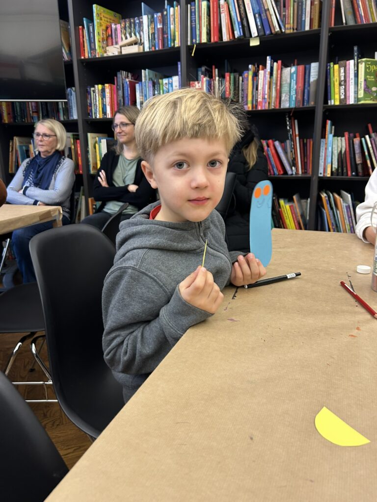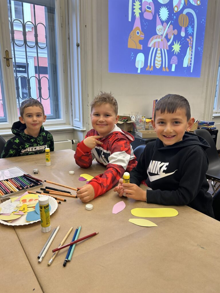 Im anschließenden Workshop wurde es dann richtig kreativ. Jedes Kind gestaltete sein eigenes Fantasiewesen aus Papier. Mit diesen selbst gebastelten Figuren entstanden danach sogar eigene kleine Bücher. Die Kinder klebten ihre Fantasiewesen hinein, zeichneten passende Welten dazu oder erfanden erste eigene Wörter und Geschichten. Die Kinder konnten ihrer Kreativität freien Lauf lassen und so entstanden viele unterschiedliche, einzigartige Bücher.