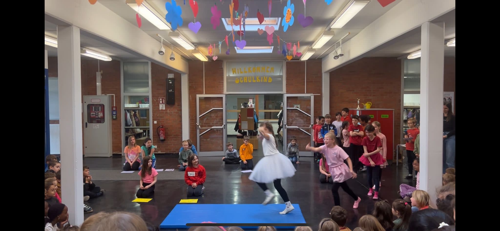 Dann haben wir, alle Kinder der 3.a und 3.c Klasse, gemeinsam getanzt. Trotz Problemen mit der Musik, kamen wir nicht aus unserem Rhythmus und tanzten die Choreografie weiter.