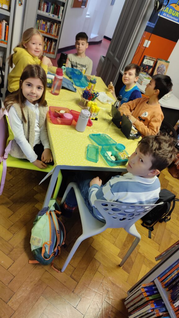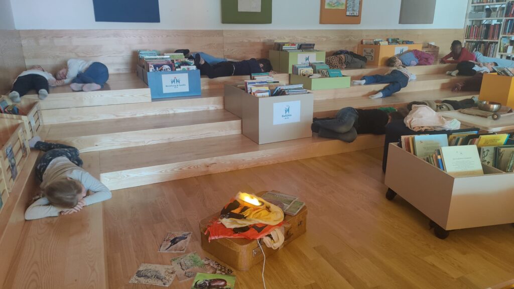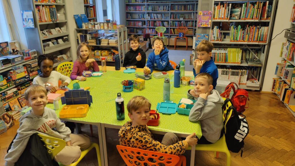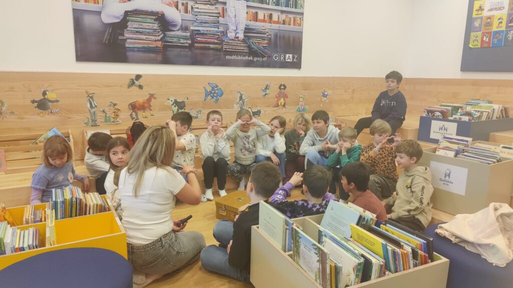 Unser zweiter Besuch führte uns in die Stadtbibliothek Graz Süd. Dort durften wir am Workshop „Bewegter Lesen“ teilnehmen. Mit dem Buch „Die hässlichen 5“ erlebten die Kinder eine ganz besondere Lesestunde: Mit viel Bewegung und allen Sinnen tauchten sie in die Geschichte ein und wurden selbst Teil der Erzählung.