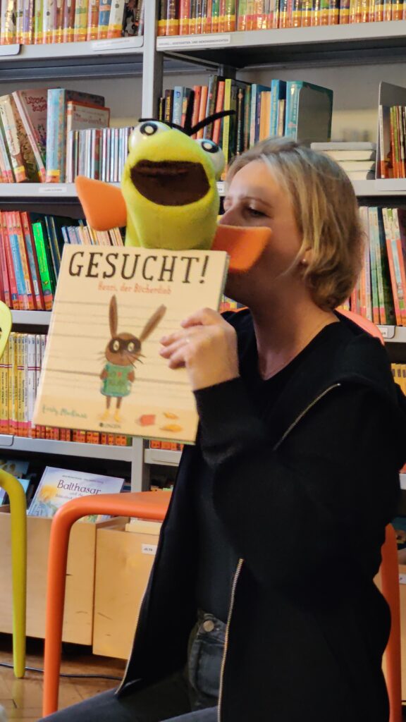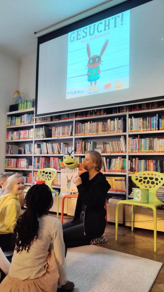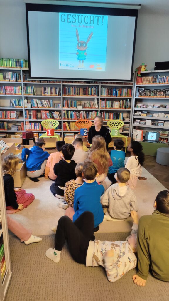 Beim ersten Besuch ging es in die Stadtbibliothek Schillerplatz. Dort nahmen wir an der Bibliothekseinführung „Labubibstart“ teil und lernten dabei das spannende Buch „Gesucht! Henri der Bücherdieb“ kennen. Spielerisch erfuhren die Kinder, wie eine Bibliothek funktioniert und wie man Bücher findet und ausleiht. Besonders viel Spaß machte auch das Basteln eines Hasen-Lesezeichens. Natürlich durfte am Ende jedes Kind noch in den Regalen stöbern und ein Buch ausborgen.